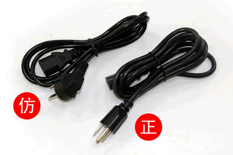 正品使用雙叉(| |)插頭;假品使用三叉插頭。